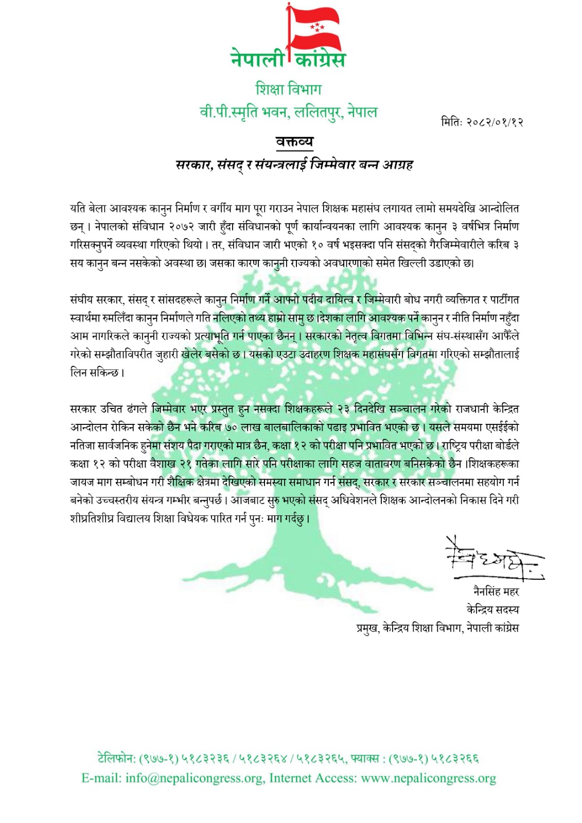 कांग्रेस केन्द्रीय शिक्षा विभाग प्रमुख समेत रहेका महरले संघीय सरकार, संसद् र उच्चस्तरीय संयन्त्रलाई जिम्मेवार बन्न आग्रह गर्दै संविधानको पूर्ण कार्यान्वयनका लागि आवश्यक कानुन निर्माणमा संसद् गम्भीर नहुनु दुःखद् रहेको बताए ।