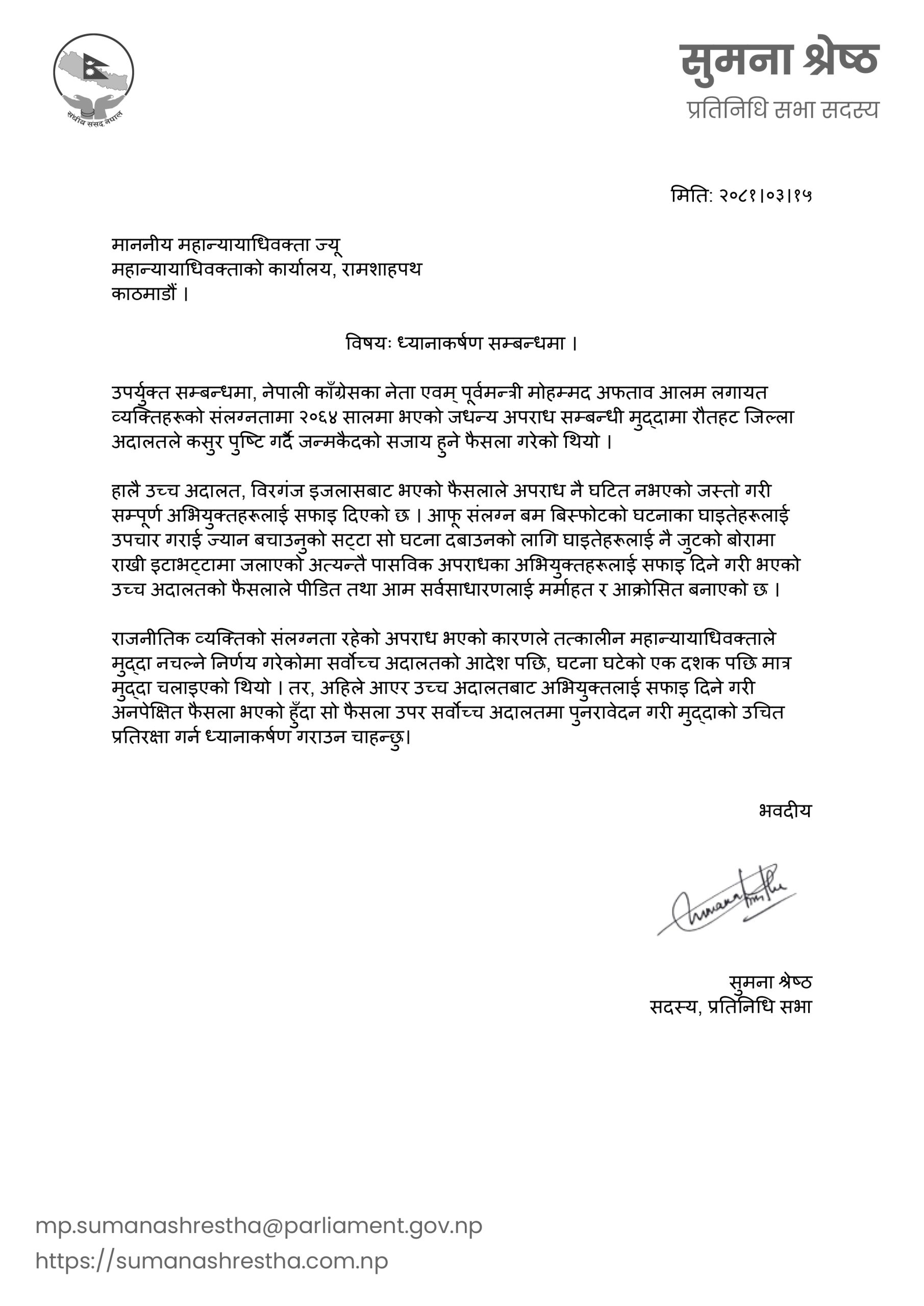 ‘राजनीतिक व्यक्तिको संलग्नता रहेको अपराध भएको कारणले तत्कालीन महान्यायाधिवक्ताले मुद्दा नचल्ने निर्णय गरेकोमा सर्वोच्च अदालतको आदेश पछि, घटना घटेको एक दशक पछि मात्र मुद्दा चलाइएको थियो,’ सांसद गौतमले लेखेको पत्रमा भनिएको छ, ‘तर, अहिले आएर उच्च अदालतबाट अभियुक्तलाई सफाइ दिने गरी अनपेक्षित फैसला भएको हुँदा सो फैसला उपर सर्वोच्च अदालतमा पुनरावेदन गरी मुद्दाको उचि प्रतिरक्षा गर्न ध्यानाकर्षण गराउन चाहन्छु ।’