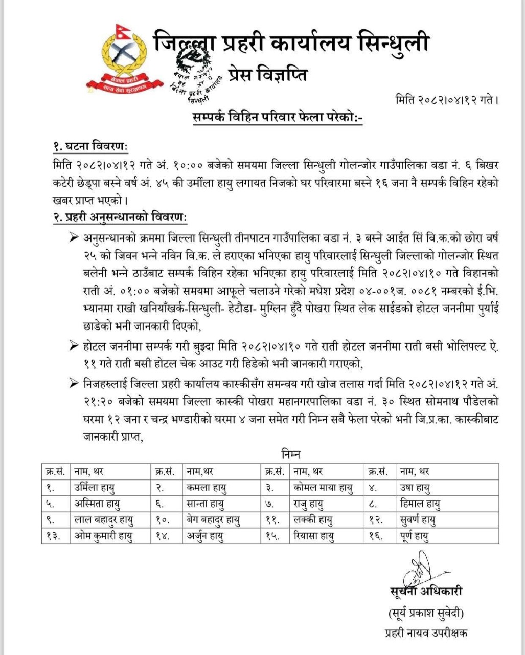 सिन्धुलीबाट सम्पर्कविहीन भएका हायु परिवारका १६ जना पोखरामा सुरक्षित अवस्थामा भेटिए