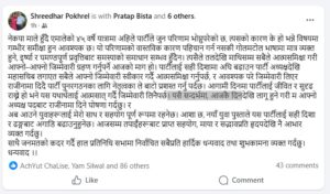 पोखरेलले तलदेखि माथिसम्म सबैले आत्मसमीक्षा गरी आ–आफ्नो जिम्मेवारी ग्रहण गर्नुपर्ने बेला आएको भन्दै पार्टी अध्यक्षदेखि महासचिवसम्मको ध्यानाकर्षण गराएका छन्। ‘पार्टीलाई सही दिशामा अघि बढाउन पार्टी अध्यक्षदेखि महासचिवलगायत सबैले आफ्नो जिम्मेवारी स्वीकार गर्दै आत्मसमीक्षा गर्नुपर्छ, र आवश्यक परे जिम्मेवारी लिएर राजीनामा दिँदै पार्टी पुनर्गठनका लागि नेतृत्वकाले बाटो प्रशस्त गर्नुपर्दछ,’ पोखरेलले स्टाटसमा लेखेका छन्।